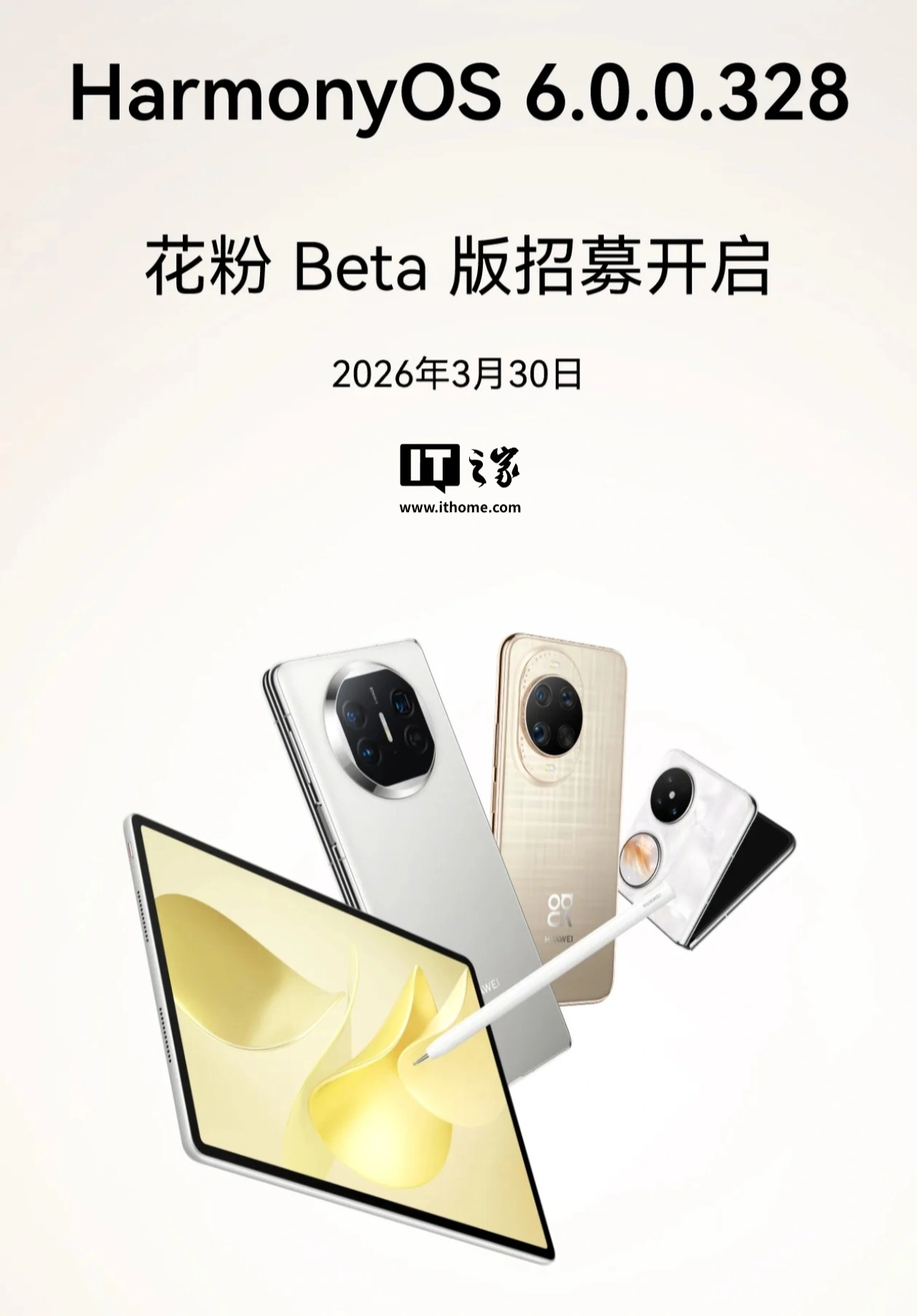 IT之家 3 月 30 日消息,华为 nova 14 / 13 / 12 系列、Mate X5 超 20 款机型今日开启了鸿蒙 HarmonyOS 6。