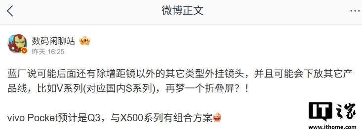 此外,他还透露,vivo Pocket 预计 Q3 发布,与 X500 系列有组合方案。