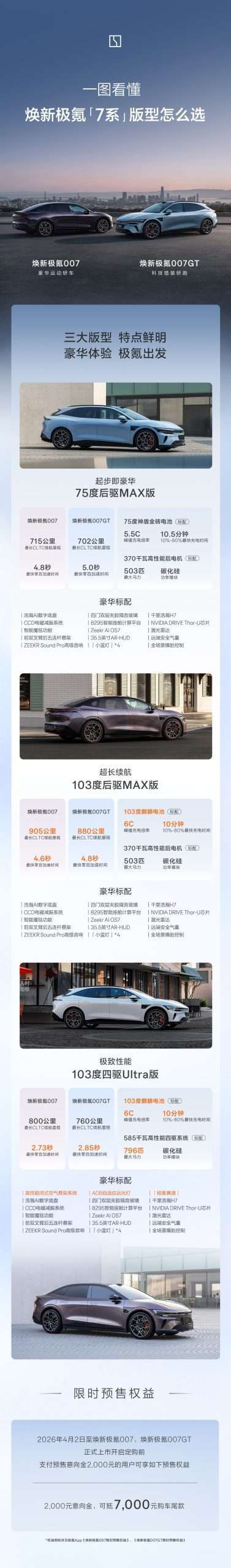 据IT之家了解,新车提供 75 度后驱 MAX 版、103 度后驱 MAX 版、103 度四驱 ULTRA 版三款配置,其中焕新极氪 007 车型续航里程分别为 715km、905km、800km,焕新极氪 007GT 车型的续航里程分别为 702km、880km、760km。
