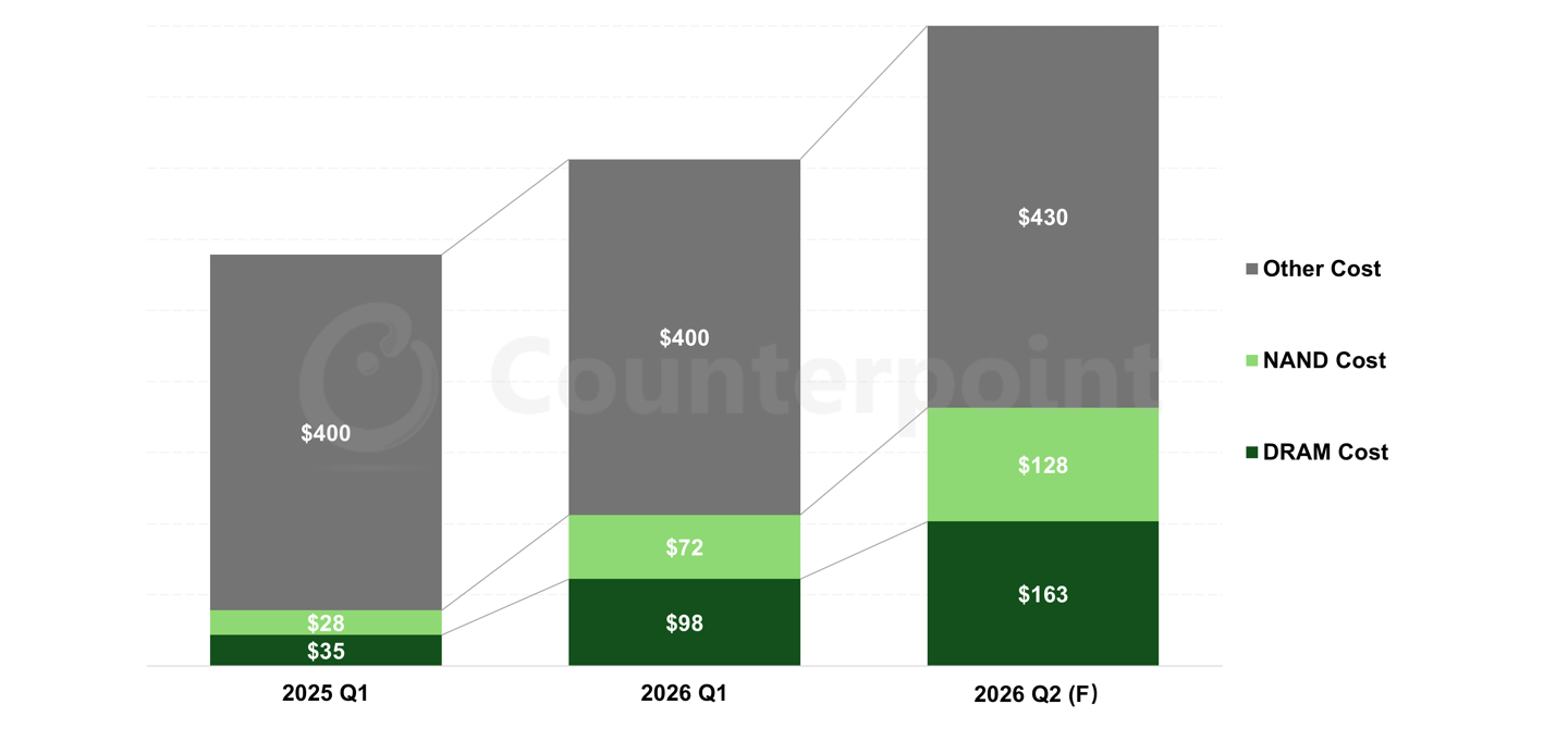 最终,高端智能手机在 2026Q2 末的物料成本将较 2025Q1 增加超过 150 美元,这可能导致最终零售价上涨超过 200 美元(现汇率约合 1377 元人民币)。