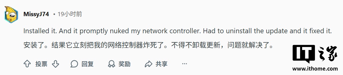 在 Reddit 等技术社区,大量测试者控诉该更新堪称“网络杀手”,有用户明确指出,系统在安装该补丁后,网络控制器直接陷入瘫痪状态,必须手动卸载该更新才能恢复断开的网络连接。