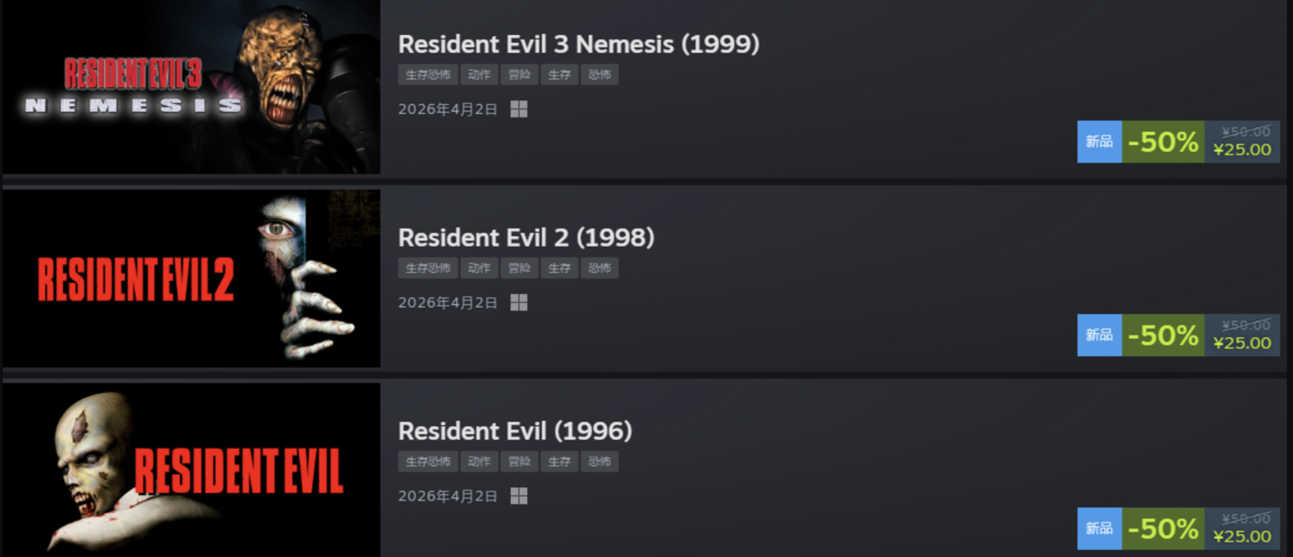 IT之家 4 月 2 日消息,卡普空现已悄悄将旗下《生化危机》经典原版三部曲《生化危机 1》《生化危机 2》《生化危机 3》搬上 Steam 平台,每款游戏国区均售价 50 元,首发 5 折后低至 25 元。