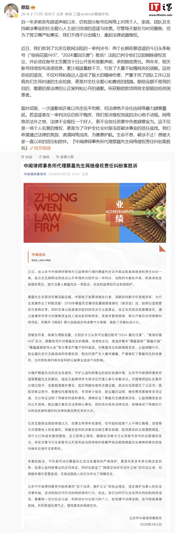 IT之家 4 月 2 日消息,渐冻症抗争者、攻克渐冻症慈善信托创立者蔡磊刚刚发文,称自一年多前发布辟谣声明以来,仍有部分账号在网络上对个人、家庭、团队及社会爱心人士持续造谣与抹黑。