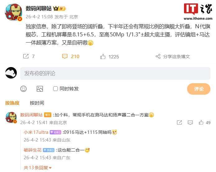 IT之家 4 月 2 日消息,博主 @数码闲聊站 今日发文透露,某厂除了即将登场的阔折叠,下半年还会有常规比例的旗舰大折叠。