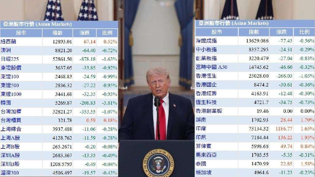 亚太股市亦普遍下跌,在特朗普讲话後半小时,StockQ平台上的32个股市中,只有七个上升,其馀25个均出现跌市。