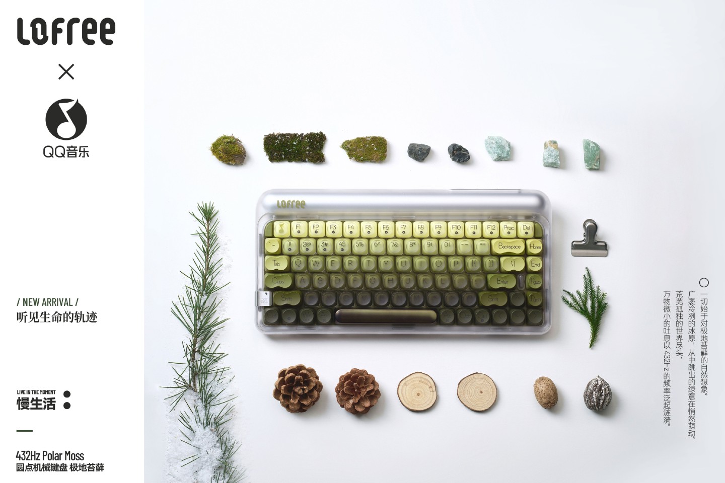 这款三模键盘采用苔原绿配色主题设计,可通过 Fn + 🎶 组合键激活 432Hz 治愈频率自然声景。