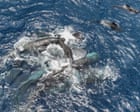科学家们成功地拍摄到一头抹香鲸分娩时,其他雌性鲸鱼共同努力支持母亲和她的新生儿。