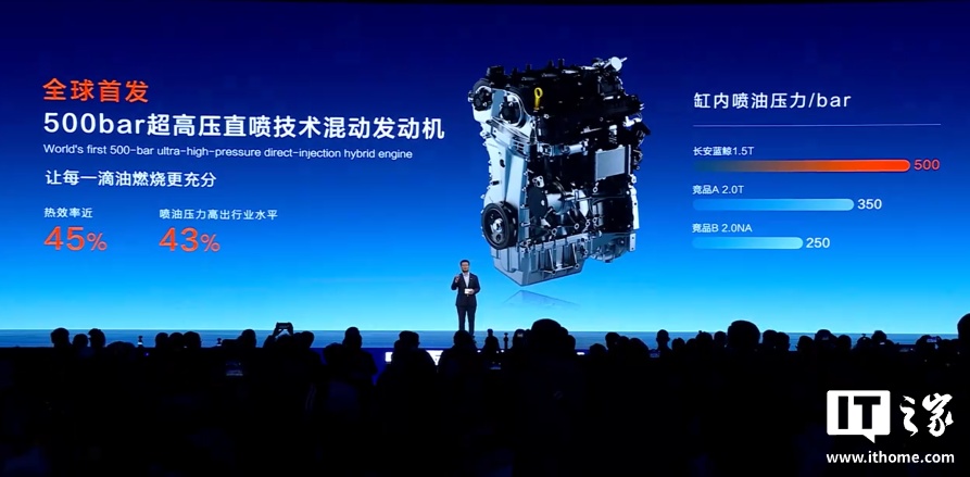 IT之家从发布会获悉,蓝鲸超擎动力全球首发 500bar 超高压直喷技术混动发动机,热效率近 45%,喷油压力高出行业水平 43%。