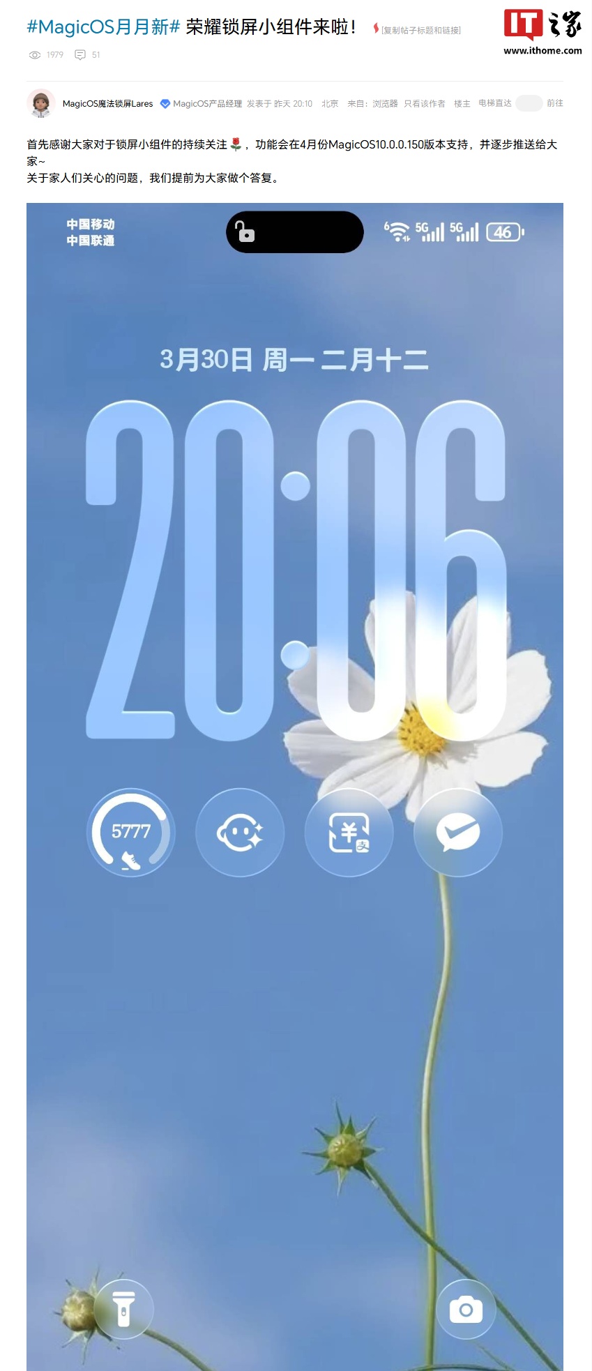 IT之家 3 月 31 日消息,荣耀 MagicOS 产品经理昨日发文,针对 MagicOS 系统的锁屏小组件相关问题进行了答疑,例如新功能何时推送、具体支持哪些小组件等。
