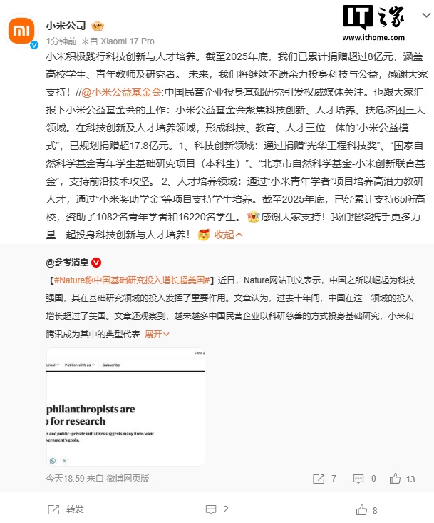 在科技创新及人才培养领域,形成科技、教育、人才三位一体的“小米公益模式”,已规划捐赠超 17。