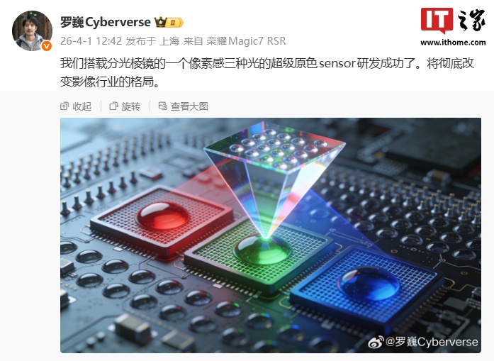IT之家 4 月 1 日消息,荣耀首席影像工程师罗巍今日发文宣布:荣耀搭载分光棱镜的一个像素感三种光的超级原色 Sensor 研发成功了。