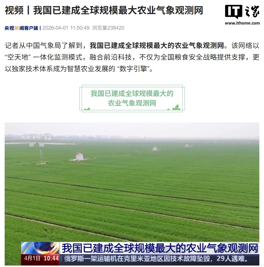 IT之家 4 月 1 日消息,据央视新闻今日报道,从中国气象局了解到,我国已建成全球规模最大的农业气象观测网。