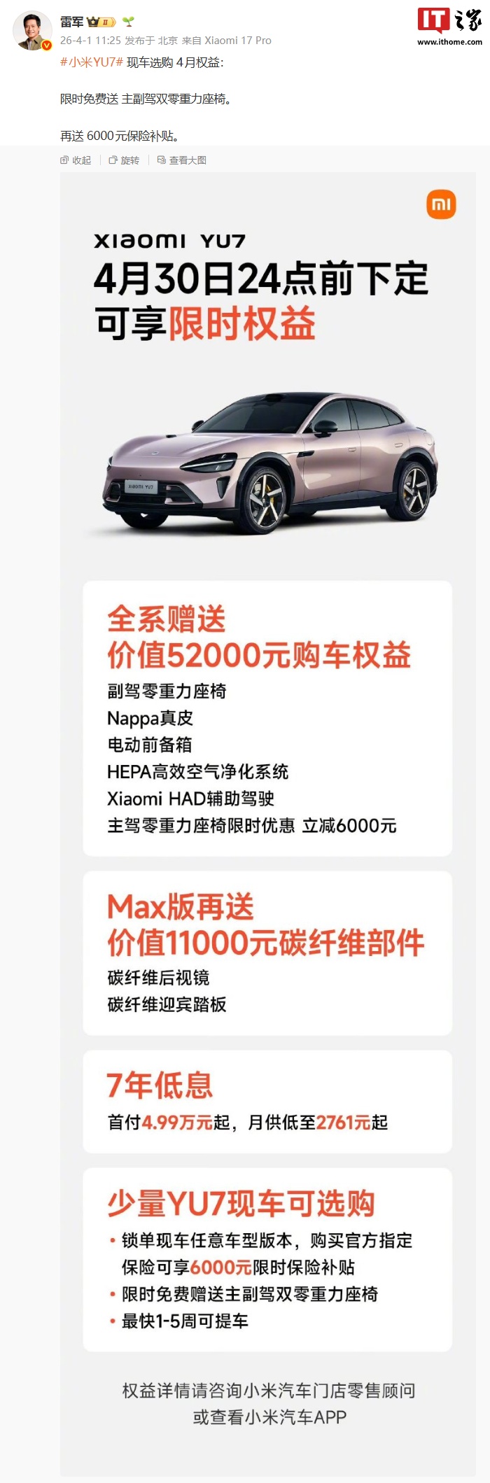 IT之家 4 月 1 日消息,小米创办人、董事长兼 CEO 雷军今日公开了小米 YU7 现车选购 4 月权益,包括限时免费送主副驾双零重力座椅等。
