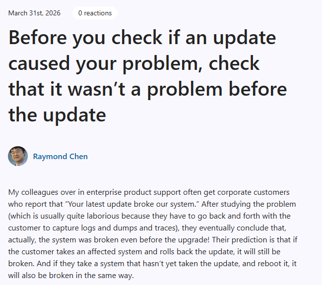 在此背景下,微软资深 Windows 工程师 Raymond Chen 于当地时间 3 月 31 日发布了一篇长文,呼吁用户不要每次都把故障归咎于 Windows 及其更新。