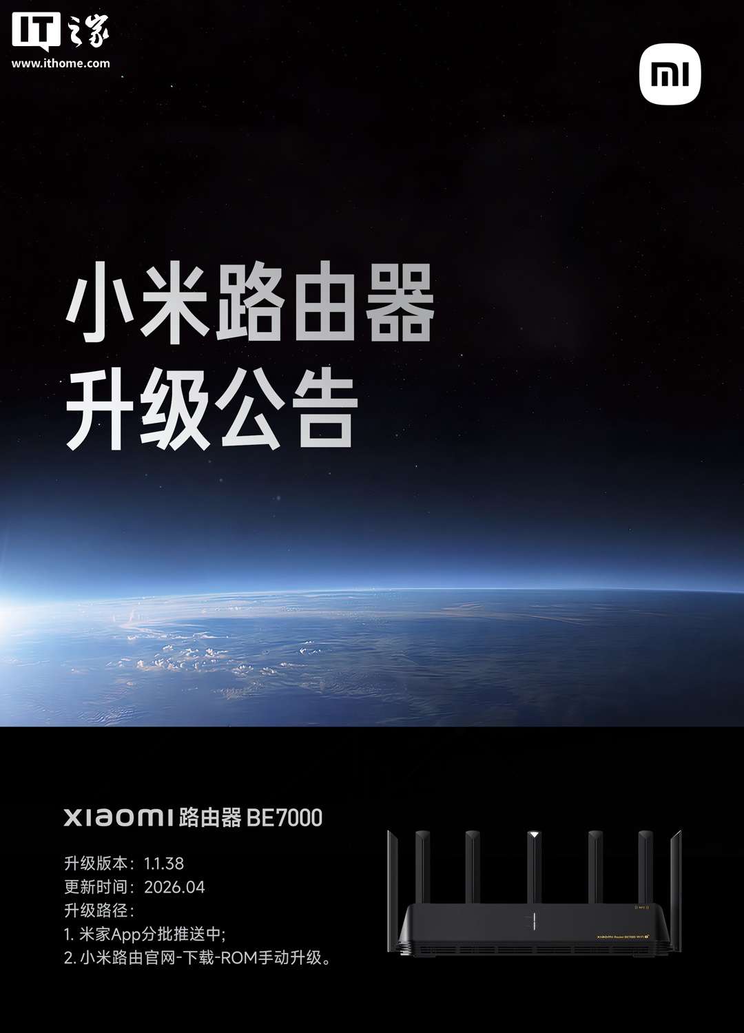 IT之家 4 月 1 日消息,小米智能生态官方微博今日宣布,Xiaomi 路由器 BE7000 迎来 1。